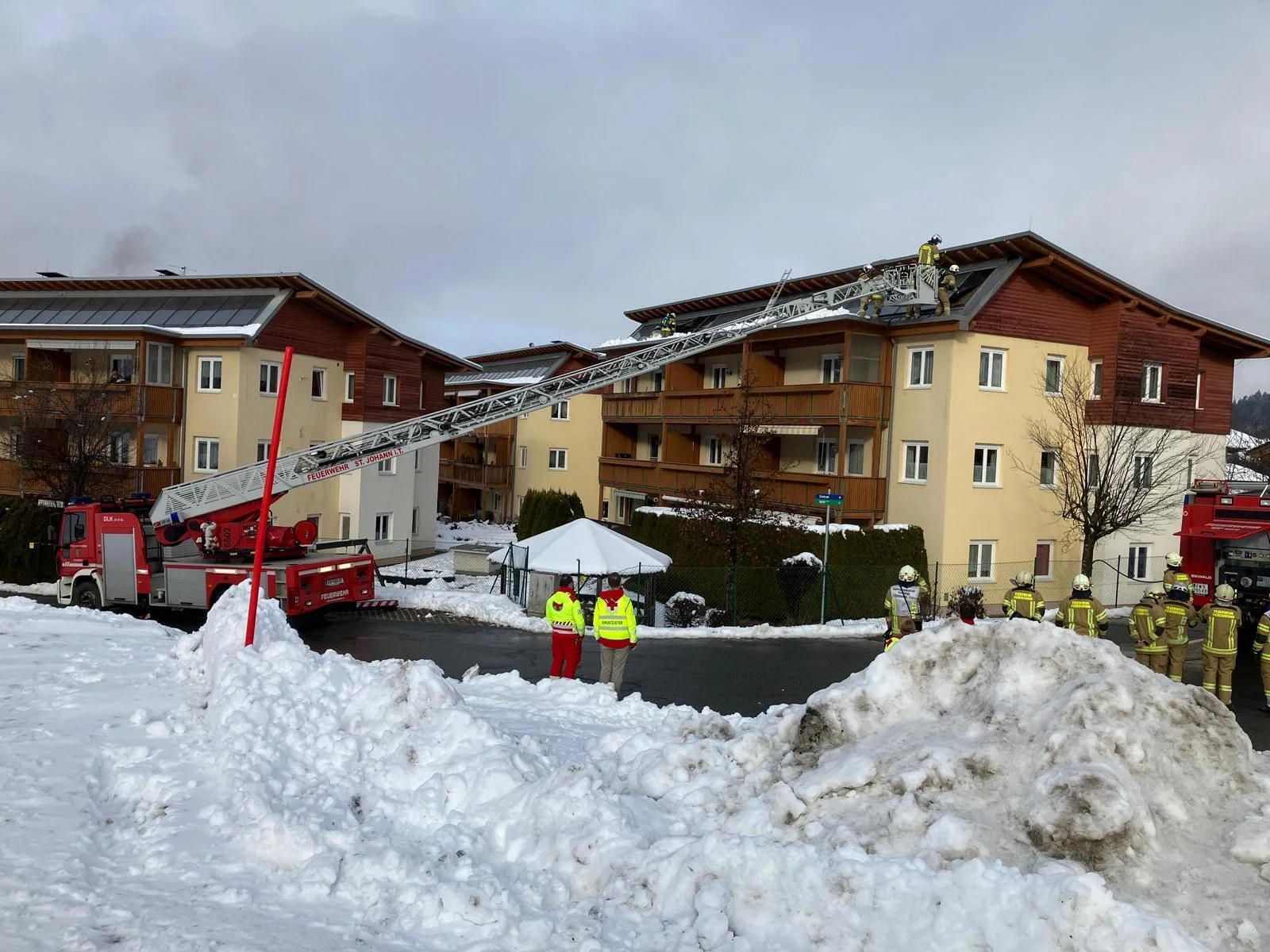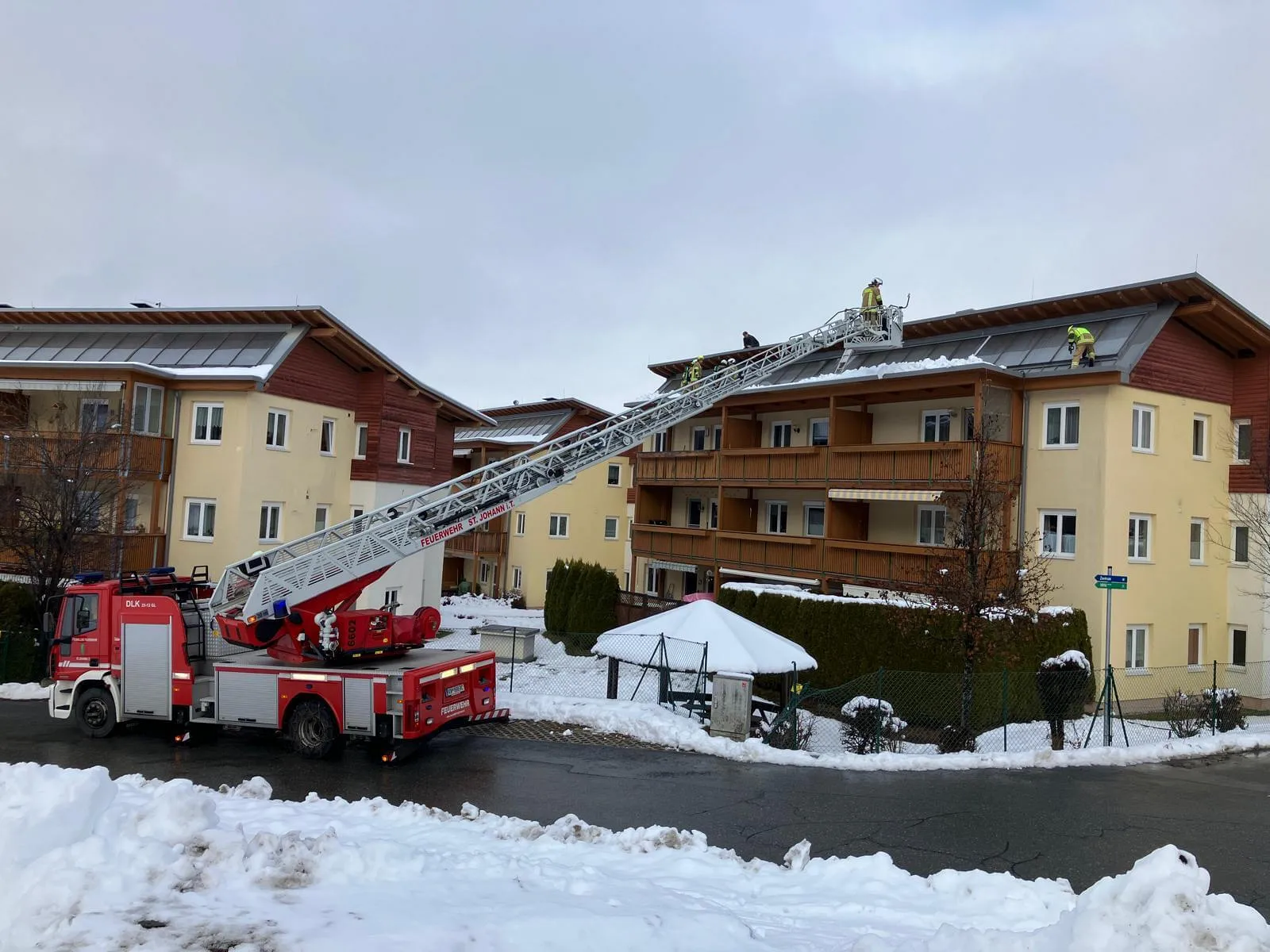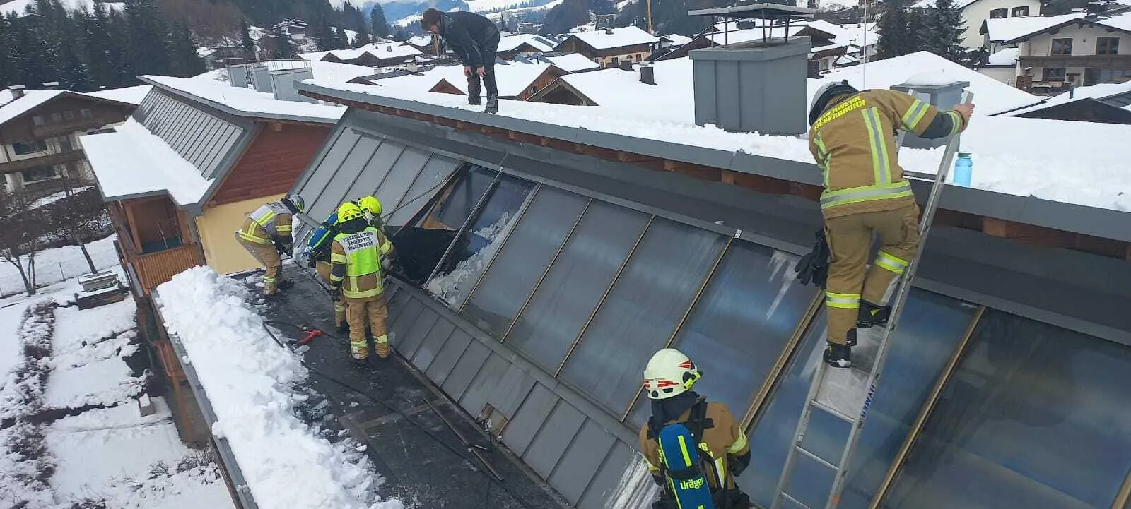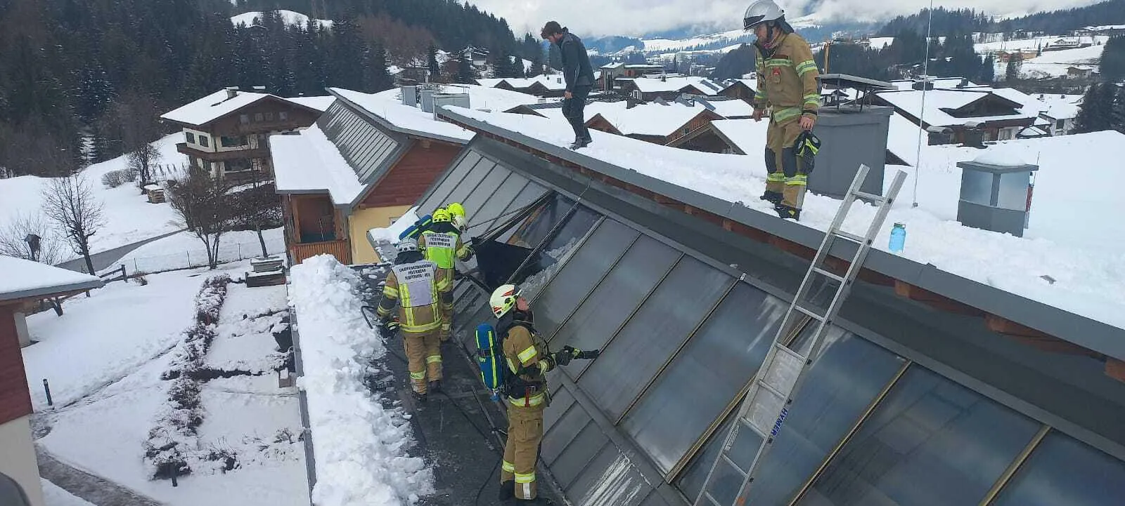 Beim Eintreffen befanden sich die Kameraden der Feuerwehr Fieberbrunn bereits am Dach. Wir unterstützten die Mannschaft mittels Drehleiter bei Material- und Personentransport.