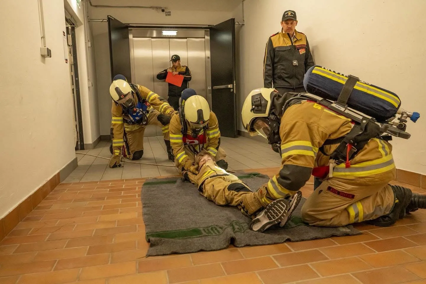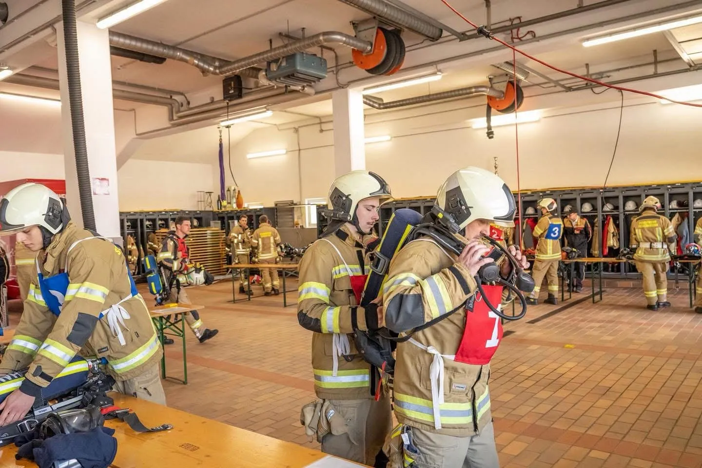 Im Anschluss folgt eine simulierte Brandbekämpfung. Danach meldet sich der Trupp bei der letzten Station, bei der das Atemschutzgerät korrekt und nach Vorschrift wieder aufgerüstet werden muss.