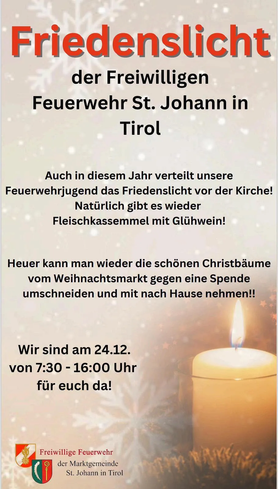Am 24. Dezember findet wieder traditionell unser Friedenslicht von 7:30 bis 16:00 Uhr statt. Vor Ort kann das Licht aus Bethlehem abgeholt werden. Für Speis und Trank...